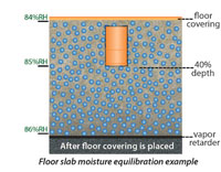 As the concrete dries, moisture evaporates. Since a vapor retarder is typically placed underneath interior concrete slab installations, all of the moisture must evaporate by traveling upwards through the slab.